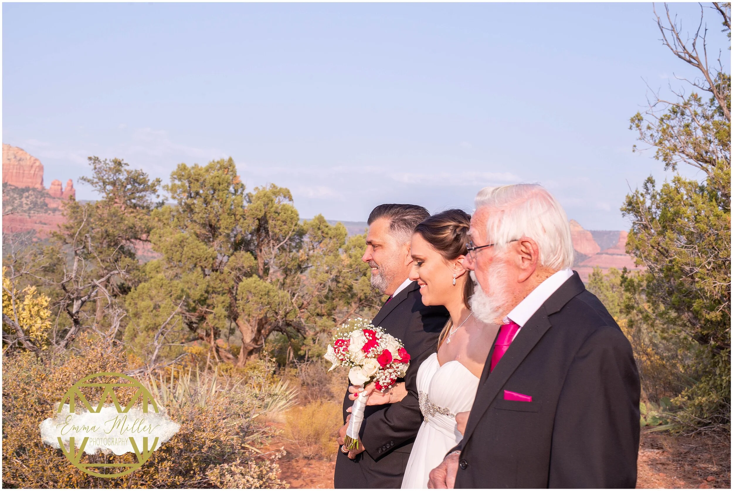 Check out this elopement, I’ve been posting sneak peeks for the last couple weeks but finally the Blog is here. Samantha found me on a Facebook post searching for vendors as they had to cancel their weeding due to covid. Making the decision to elope to Sedona may not have been their first choice however it was a beautiful one. Meeting up, I first met Samantha’s father, and Grandparents. I learned they had yet to see the bride so we set up a first look for them. The photos will not disappoint. Samantha’s Dad became overwhelmed at the sight of his daughter and moved me to tears. Grandma and Grandpa also looked at Samantha and joy and pride beamed from them. You could see just how loved our bride is. Once we set forth to the ceremony site I pulled Zach away to get him all set up for the first look of his very soon to be wife. While calm and collected Zach admitted to being a bit nervous but overall excited to be getting married to Samantha. He was a natural model, I’d make a suggestion he’d be set in pose before I could finish my request. (making my job soooooo easy) I had him wait on the path while I brought his bride to be back for their first look. Samantha’s beauty strikes again, taking the breath away from her groom and moving him to tears. Zach turns, his face was full of surprise and admiration, clutching his chest in disbelief he was shook. As Samantha walks toward her groom he starts to cry, they embrace and she dries his tears. Giving them a few moment to soak it in and appreciate the moment I just keep clicking away. Once they were ready, I took them to another little spot just bit away from their party to keep their moment uninterrupted. These two were so easy to pose and work with like previously mentioned I’d make a suggestion and before I could finished they were posed into exactly what I was looking for. Soon the Minister arrived and we began the ceremony, The Sedona Mountains surrounded them making their ceremony a magical spot. Immediate family watched while the couple said their vows and were married. Simple sweet and to the point.